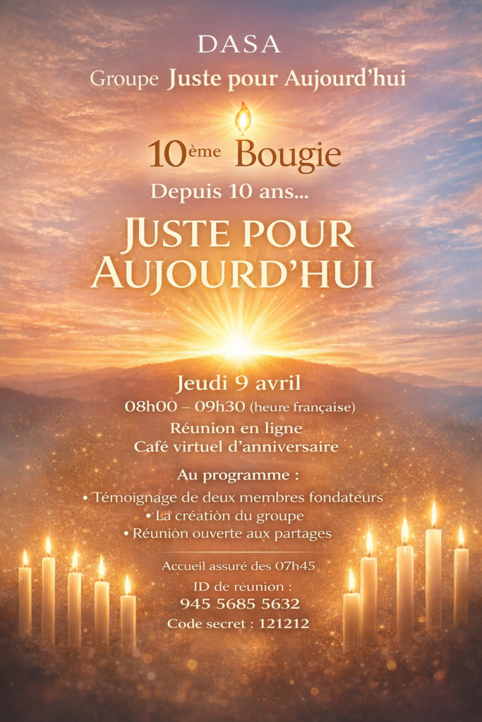 📅 Jeudi 9 avril 2026 : Le groupe Juste pour Aujourd’hui vous invite à son 10 ème Anniversaire. Détail de la connexion sur l’affiche ici bas.